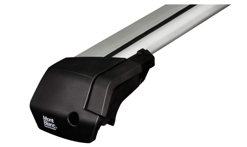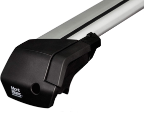 Barre de toit Mont Blanc, en ALUMINIUM AVEC FORME AERODYNAMIQUE, avec jeu de fixations sur barres longitudinales et système antivol.